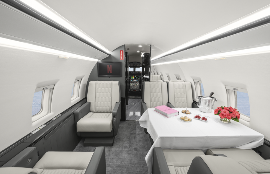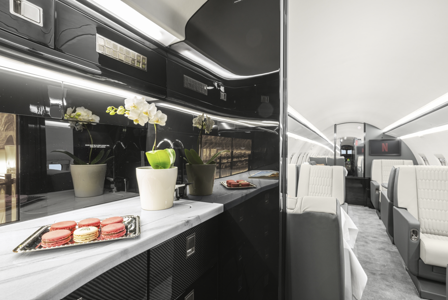 All new soft furnishings in tasteful shades of grey, carbon fibre wood surfaces, stylish white marble countertops and stone floors in the galley and vanity area make for stylish finish. The luxury interior is complemented by ultra-high-speed Ku-Band connectivity and Apple TV, further elevating the in-flight experience. The exterior designer paint features a stunning new finish in silver grey metallic with one black stripe.